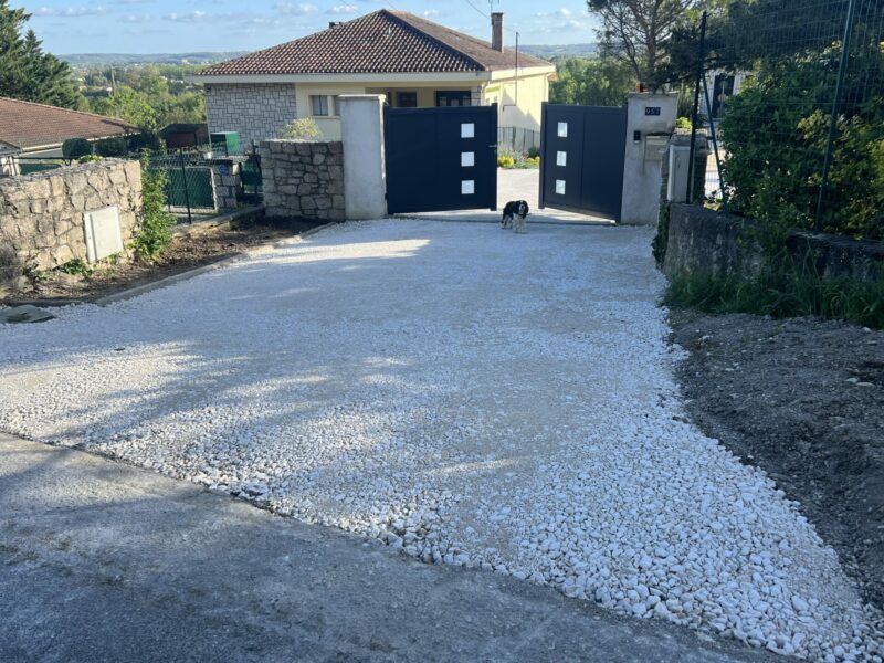 Implantation, terrassement (création des pentes nécessaires à l’écoulement des eaux de pluie, création de caniveaux à grille ou de grilles avaloirs si nécessaire), pose d’un géotextile, d’une couche de fondation en calcaire ou en grave recyclée, réglage fin et compactage soigné avant l’application de la couche de roulement.