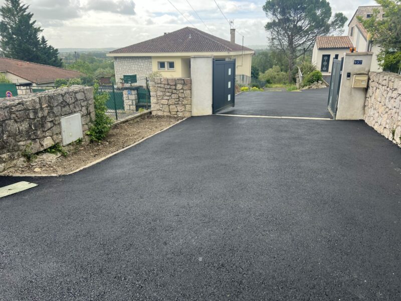 Mise en œuvre manuelle ou mécanique d’enrobés à chaud pour des allées piétonnes, accès privatifs, parkings . Solution moins onéreuse, mais moins pérenne, par application d’un enduit superficiel type monocouche ou bicouche ; épandage d’une couche d’émulsion de bitume, puis de gravillon 6/10, de nouveau une couche d’émulsion et de gravillon 2/6 en finition, compactage sans vibration